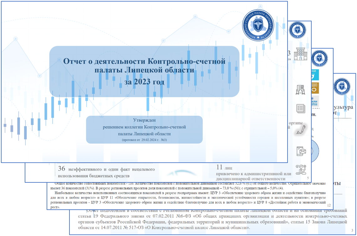 В рамках прошедшей 26 марта 2024 г. сессии Липецкого областного Совета депутатов председателем Контрольно-счетной палаты Липецкой области Хожайновой Ларисой Владимировной был представлен отчет о деятельности палаты в 2023 году. В отчетном году палата проводила проверки и анализ различных вопросов в важнейших сферах жизни региона, среди которых жилищно-коммунальное хозяйство, строительство, реконструкция объектов социального назначения, образование, физическая культура и спорт и другие важные вопросы. В соответствии с Планом работы в отчетном году проведено 83 мероприятия, из них: 11 контрольных и 72 экспертно-аналитических мероприятия, объем охваченных проверками средств составил более 13 млрд рублей.